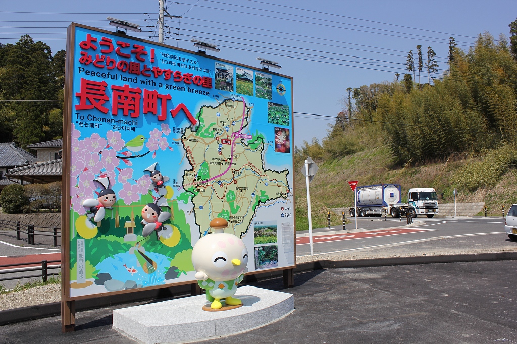圏央道の茂原・長南ICの出入り口付近に町の観光看板とちょな丸像が設置されました。