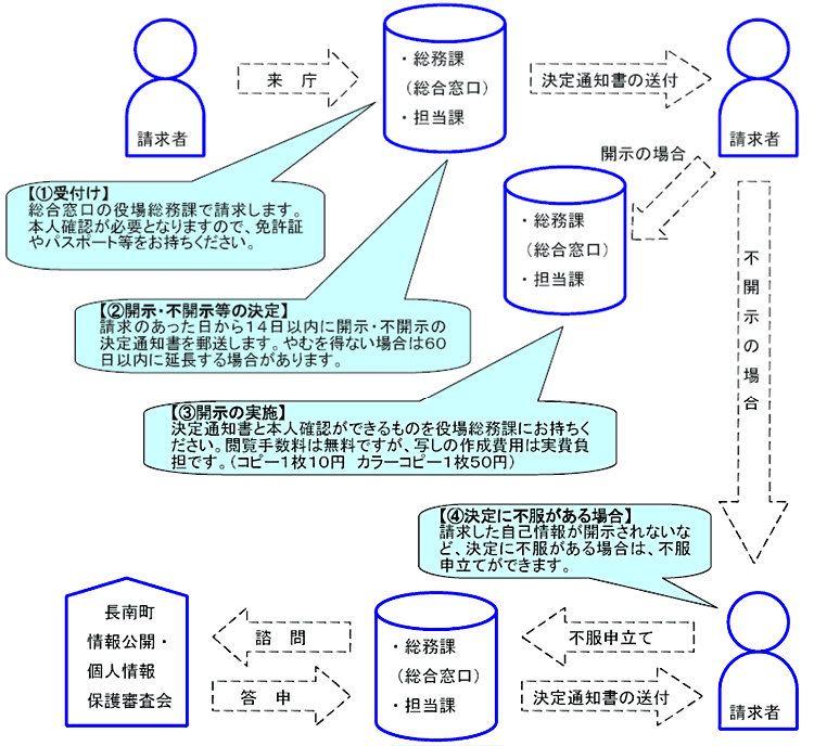 - 開示、訂正、利用停止等の請求に対する決定に不服がある場合は、行政不服審査法による不服申立てができます。その場合は、長南町情報公開・個人情報保護審査会に諮問し、その答申を尊重して決定します。
