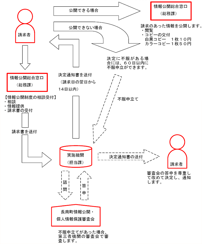 - 非公開の決定に不服がある場合は、行政不服審査法により不服申立てを行うことができます。その場合は、不服申立てが不適法な場合等を除き、長南町情報公開・個人情報保護審査会に諮問し、その答申を尊重して決定します。