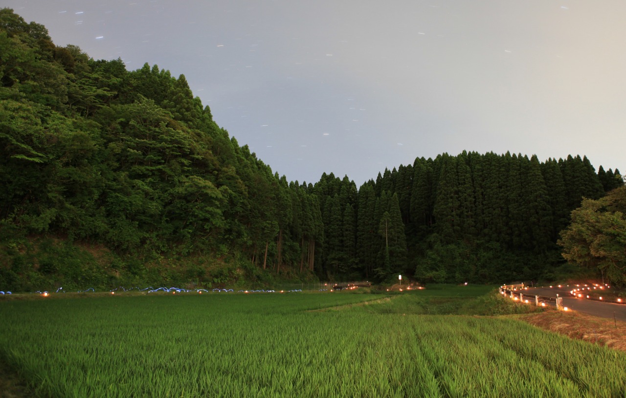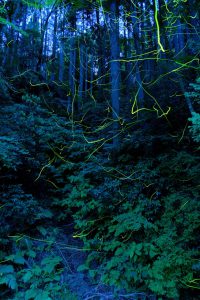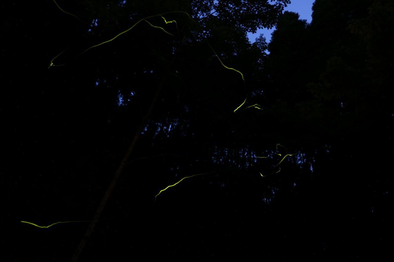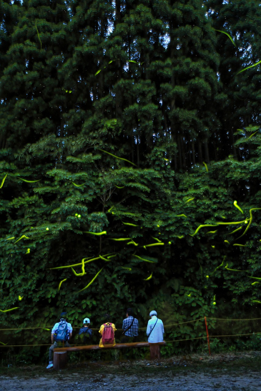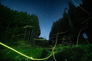 自然豊かな山内地区を背景に、美しい光を放つゲンジボタルたちを撮影した
