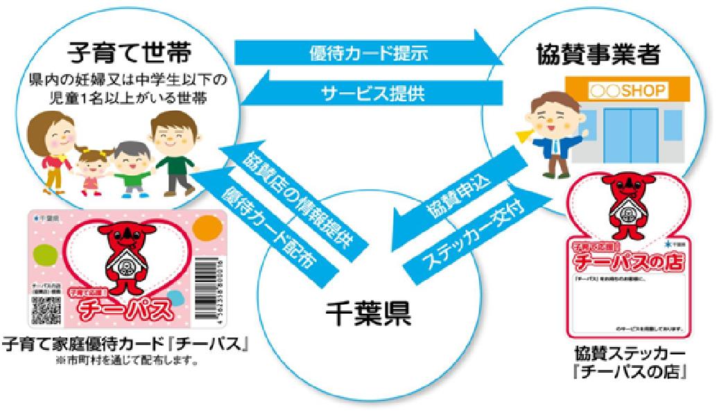千葉県では、「子育てサポート日本一」を目指し、県内すべての子育て家庭を応援するため、事業者の協力を得て「子育て応援!チーパス事業」を開始し、平成28年4月から「チーパス」が全国で使えるようになりました。