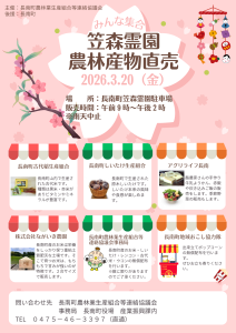 長南町笠森霊園駐車場にて、下記のとおり「笠森霊園農林産物直売」を実施いたします。また、長南町産のお米・しいたけ・レンコン・古代米・ウコンの無償配布を行いますので、皆さまのご来場をぜひお待ちしております。