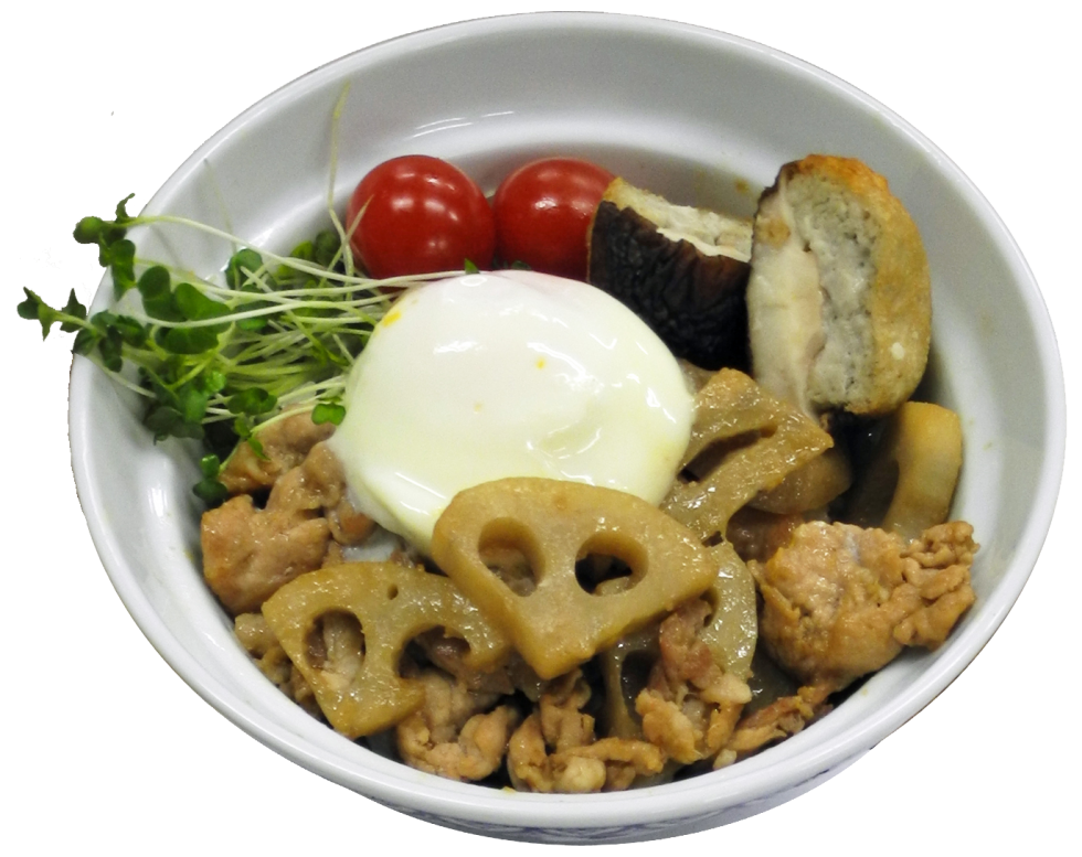 ビタミンB1の豊富な豚肉とれんこんを一緒に摂ることでエネルギー代謝がアップし、疲労回復効果が期待できます。また、しょうがを効かせたので体が温まり、れんこんのビタミンCと共に風邪予防効果もある寒い時期にぴったりな一品です。れんこんのシャキシャキ感や肉厚なしいたけ、ふんわりとした自然薯など様々な食感が楽しめる丼です。