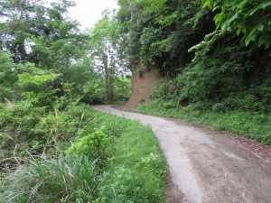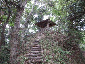 中之台バス停から、町道を5分ほどゆくと、右手に報恩寺があります。切通しの山あいの道を進み、なだらかな坂を下ると中原地区に入ります。左に丘、右に田園の平坦な道が続き、油殿古墳群があります。さらに南に進むと、能満寺です。森の中に能満寺古墳が見えます。能満寺古墳は、東国での古墳発生期(4世紀末~5世紀初頭)の古墳で、この時期の古墳としては県内最大規模です。この森を下ると睦沢町上之郷へと続きます。