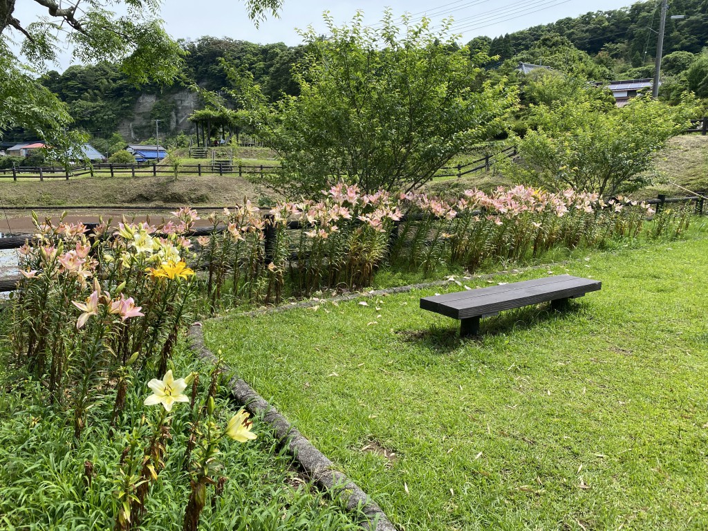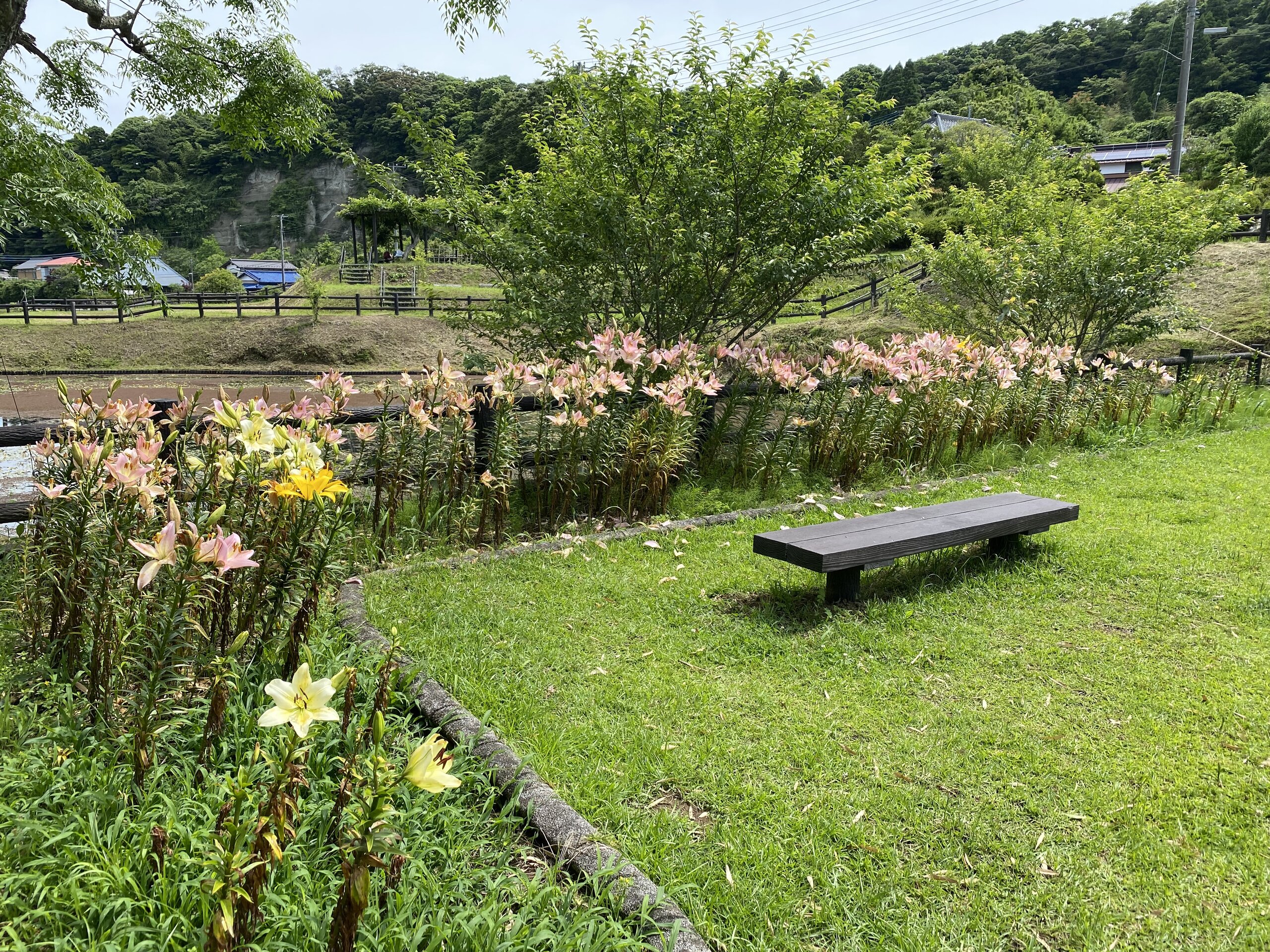 現在の熊野の清水公園はユリの花がきれいに咲いております。