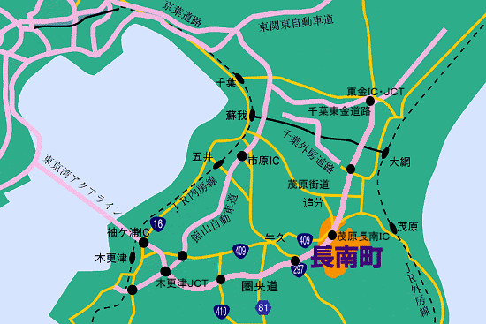 ●東京・千葉→京葉道路または東関東自動車道→千葉東金道路「東金IC・JCT」→圏央道「茂原長南IC」→国道409→長南 ●東京湾アクアライン→「木更津JCT」→圏央道「茂原長南IC」→国道409→長南