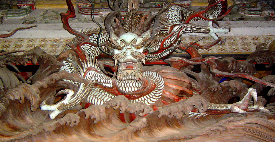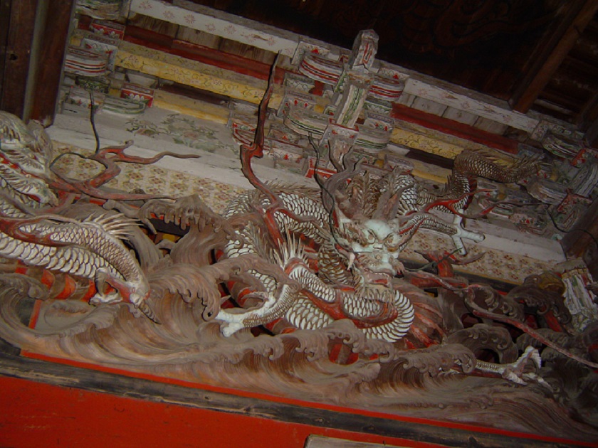 称念寺本堂欄間の荒波を巻き起こす疾風の如き龍三態の彫刻は、「波を彫らせたら日本一。」と謳われた名人・波の伊八こと初代武志伊八郎信由の作で、江戸時代後期の文化・文政年間に製作されました。3体の龍は右が紅、中央が青、左が白で彩色されていますが、彩色は後補の可能性もあります。初代伊八晩年の集大成と言うべき大作です。 称念寺/長南町千田 →地図 ※本堂内への立入りはできません。 |