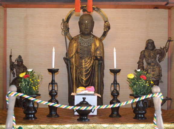 地蔵像と天部像二躯はともにヒノキ材の寄木造りで、目は玉眼、表面は漆箔で仕上げられています。また、地蔵像の白毫は水晶製で、背面材には三躯を長徳2(996)年に恵心僧都(源信)が彫ったとする朱書がありますが、像容から地蔵像は南北朝~室町、天部像は鎌倉後期と推定されます。 報恩寺/長南町報恩寺 →地図 ※通常は非公開。 |