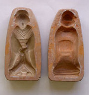 芝原人形(→コラム「芝原人形あれこれ」)は江戸浅草の今戸人形の流れをくむ素朴な土人形で、その名のとおり、明治時代初め頃から長南町芝原の田中家で、この地方のひな人形として製作されていました(現在は4代目千葉惣次氏が製作)。振ると人形の中の粘土玉がカラカラと鳴ることから”石ころ雛”の別名があります。製作用具は原型・抜型・彩色用具等で、明治~昭和40年頃まで田中家で使用されていたものです。 長南町郷土資料館保管(個人所有)/長南町長南 →地図 ※長南町郷土資料館で常設展示しています。 |