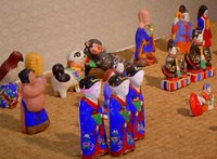 江戸浅草の今戸人形の流れをくむ雅な極彩色の土人形で、振ると人形の中に入れた粘土玉がカラカラと鳴り、素朴な温かみをより深めます。千葉県を代表する民芸品で、明治初期より長南町芝原の田中家三代にわたって作られてきました。現在は四代目を継承した千葉惣次氏が製作しており、岩撫の「芝原人形工房」で展示されています。 →コラム「芝原人形あれこれ」